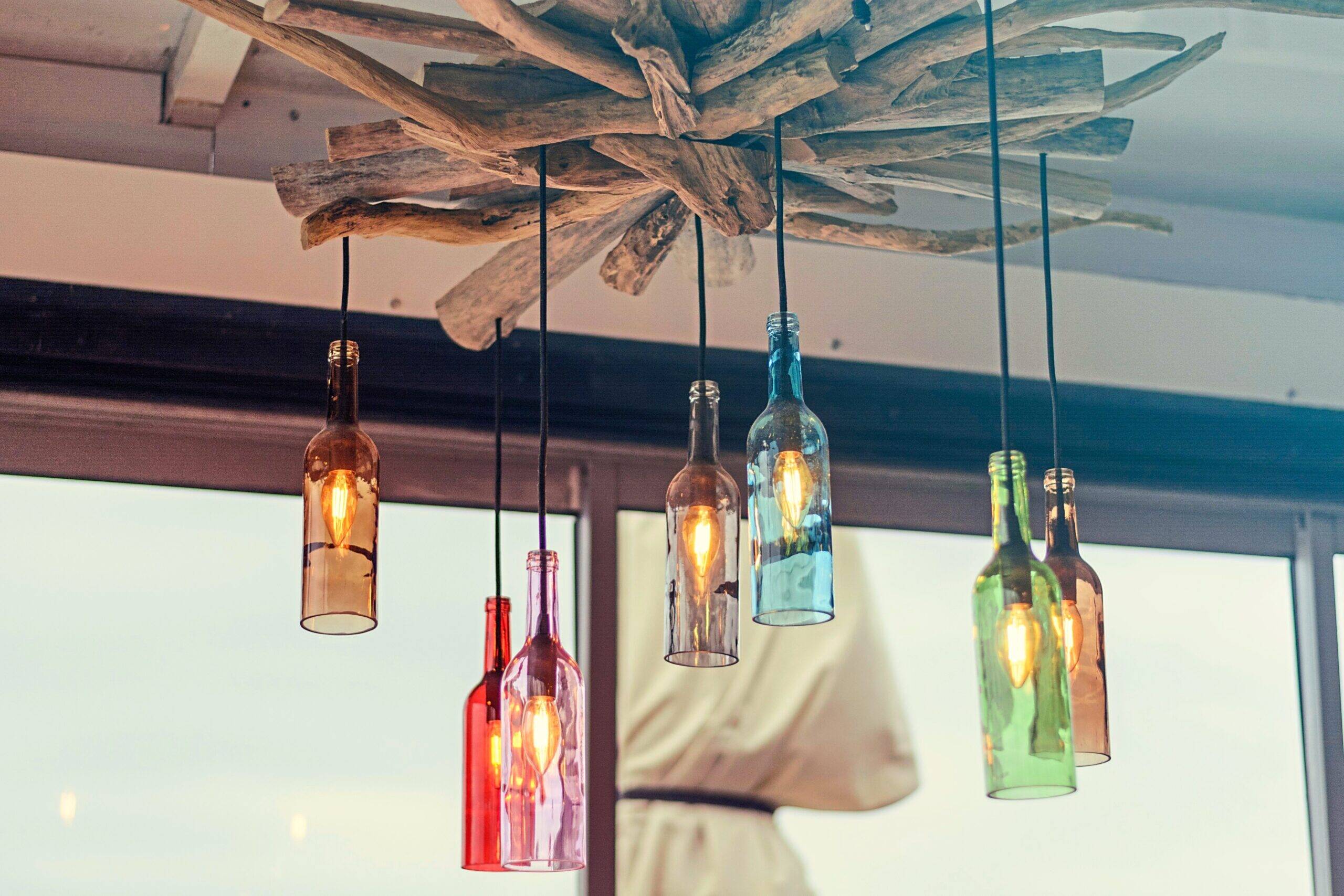 Carefully cut off the bottom of each bottle, then feed a sturdy wire through the neck and add a socket and bulb. Attach to a strong ceiling mount.