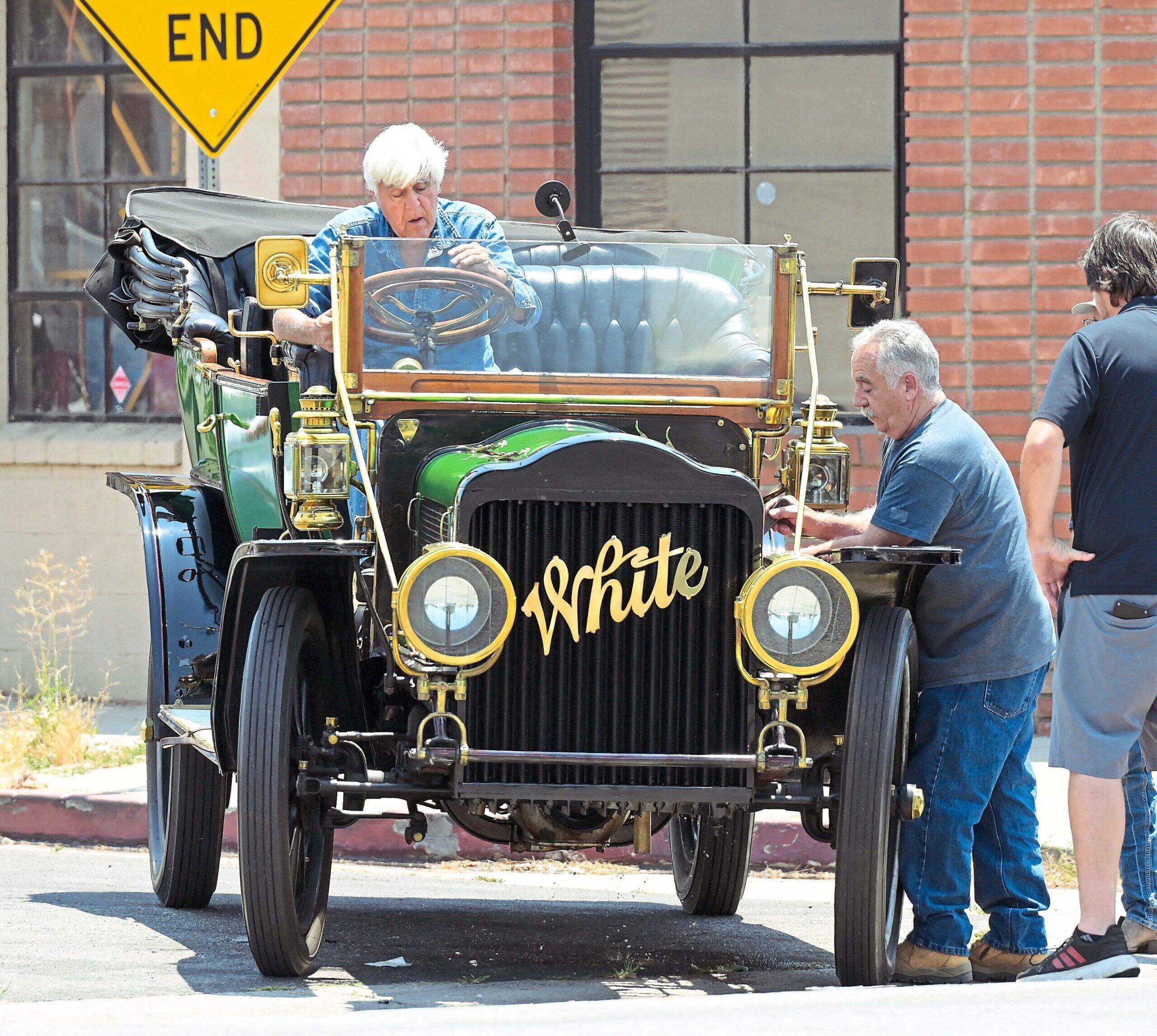 The late-night legend appeared frail and haggard during a July 14 joyride in his vintage 1910 steam car. (He owns roughly 180 cars and 160 motorcycles.) When his ride broke down, Jay was seen fruitlessly trying to figure out the problem. Ultimately, a tow truck was called.