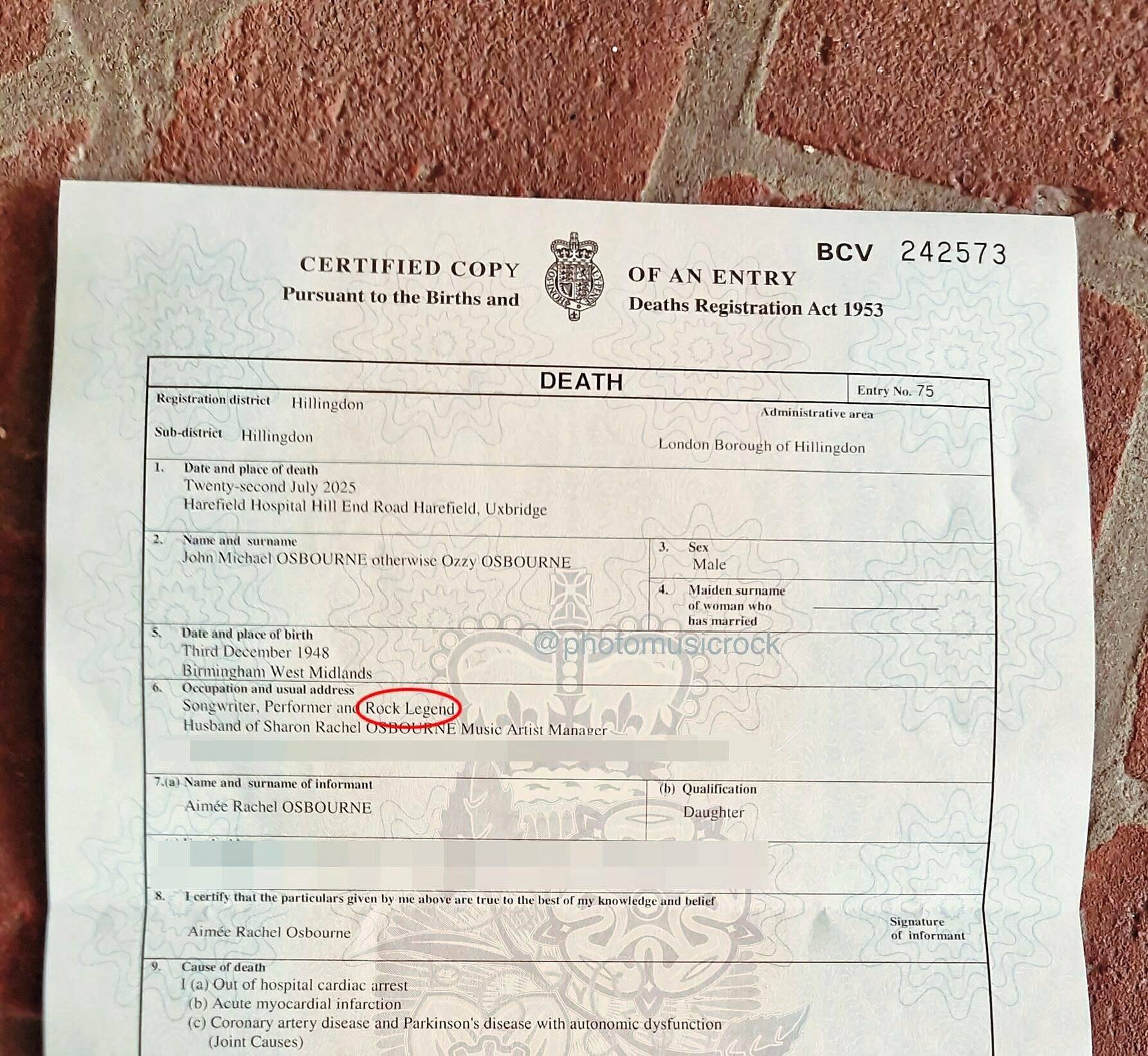 Ozzy Osbourne is a rock legend… because his death certificate says so! On the government document from the London Borough of Hillingdon, Ozzy’s occupation is listed as “Songwriter, Performer and Rock Legend.”